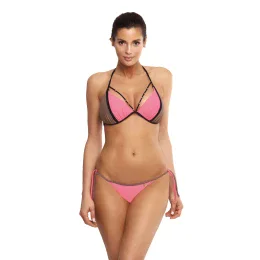 Hladké košíčky s kontrastním černým lemováním jsou vyztužené, bez push-up, dobře sbírají a zpevňují prsa a zároveň je přibližují k sobě. Výstřih je doplněn dvěma ozdobnými pásky zakončenými drobnými šperky. Svůdné bikiny s nízkým sedem jsou velmi ženskou volbou na pláž. Italská tkanina. Složení: 80 % polyamid, 20 % elastan.