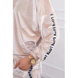 Predstavujeme vám súpravu mikiny a nohavíc. Súprava je vyrobená z velúru. Mikina má stuhy s nápisom Love. Nohavice majú vrecká a zaväzujú sa v páse. Veľmi módna a štýlová súprava. Súprava je vyrobená z kvalitného materiálu. Veľkosť je univerzálna a hodí sa pre dámy veľkosti S, M alebo L.