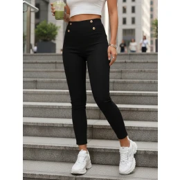 Legginsy o dopasowanym kroju podkreślają sylwetkę i zapewniają wygodę w codziennych stylizacjach. Wysoki stan modeluje talię i optycznie wydłuża nogi. Elastyczny ściągacz w pasie poprawia dopasowanie do figury. Ozdobne guziki nadają całości eleganckiego charakteru.