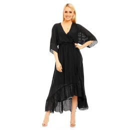 Vzdušné dámské šaty, které se hodí na formální, ale i neformální události. Tento model má výstřih do V a rukávy ve stylu batwings. Součástí šatů je i pásek, který krásně zvýrazní ženský pas. Sukně je dlouhá, ale asymetrická. Spodní lem sukně je ozdoben volánem. Šaty jsou šity jako dvouvrstvé, kdy spodní vrstva je z materiálu, který je neprůsvitný a druhá vrstva je z materiálu, který lehce prosvítá. Oblečte si tyto šaty a pohodlí je zaručeno. Materiál, ze kterého jsou šaty vyrobeny je elastický a příjemný na omak. Kvalitní dámské šaty. Šaty jsou vyrobeny z materiálu 95 % polyester a 5 % elastan Kvalitní a levné šaty. Dámské značkové oblečení vyrobené pro EU. Doporučujeme, abyste se řídili níže uvedenými rozměry, naměřenými na oblečení (odchylka +/- 1-2 cm). S/M M/L Prsa 82 88 Pas 52 - 92 62 - 96 Boky Volný střih Volný střih Délka šatů 117/140 120 - 140 Naměřené míry jsou uvedeny v cm (v klidovém stavu - po natažení) a reprezentují celkový obvod šatů. Materiál: 95 % polyester, 5 % elastan Praní, žehlení: pouze ruční praní na 30°C, žehlení při maximální teplotě 110°C Polyester - jedná se o syntetické vlákno, které díky svým skvělým vlastnostem předstihlo bavlnu v celosvětové textilní spotřebě. Hlavní surovinou pro její výrobu je již dnes všudypřítomná ropa. Polyester je stálý na světle. Jeho vzhled je podobný hedvábí. Oděvy z polyesteru málo navlhají a rychle schnou. Polyester se díky svým vlastnostem velmi často užívá pro výrobu dámských šatů. Látky z polyesteru jsou lehké, méně mačkavé až nemačkavé, jsou pevné a trvanlivé. Elastan - syntetické vlákno na bázi polyuretanu, jejíž hlavní vlastností je vysoká elastičnost. I při natažení na několikanásobek své délky se elastan navrátí do původní délky a tvaru. Textilie s příměsemi elastanu skvěle obepínají tělo, aniž by bránily pohybu. Používají se pro výrobu různého elastického oblečení (sportovního, spodního prádla, plavek, dámských šatů, atd.). I jen několik procent elastanu významným způsobem zlepšuje užitné vlastnosti textilií. Známé obchodní názvy elastanu jsou Spandex a Lycra.