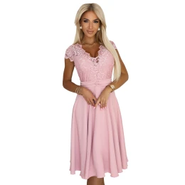 Elegantní šaty s krajkovým vrškem a rozšířeným spodním dílem v pudrově růžové barvě. Ideální na svatby, přijímání a zvláštní příležitosti. Polský výrobek - značka Numoco.