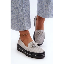 Błyszczące Mokasyny Damskie Skórzane Na Platformie S.Barski LR400 Srebrne