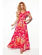 LIDIA - Ružové kvetované dlhé dámske šaty s výstrihom a volánikmi 310-4