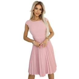 Plisované midi šaty v lila barvě s krátkými rukávy, páskem na zavázání a skrytým zipem. Stylové a ženské, ideální na svatby a elegantní večírky. barva pudrově růžová. polský výrobek. značka Numoco.