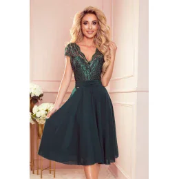 LINDA - Dámske šifónové šaty vo fľaškovo zelenej farbe s krajkovým výstrihom 381-2