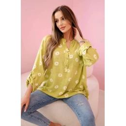 Dámska ľanová blúzka s kvetinovým vzorom, dlhými rukávmi a gombíkmi kiwi