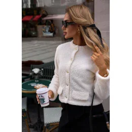 100% polyester INFORMÁCIE O PRODUKTE: medvedík pletená krátka bunda zapínaná vpredu na gombíky ozdobné zlaté gombíky umelé vrecká s chlopňou plne podšitá Náš model je vysoký 171 cm a nosí veľkosť S navrhnutý a vyrobený v Poľsku