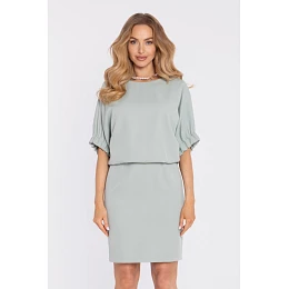 95% polyester 5% elastane MATERIAL Smooth woven fabric with a matte finish. PRODUCT DETAILS Neckline: front – round and modest; back – deeper vertical slit fastened with a single button. Sleeves: short, puff sleeves finished with elastic cuffs. Waist: subtly defined thanks to the blouson-style top. Skirt: straight, slightly fitted, with a short back slit. Closure: single button at the back neckline; concealed zip at the back. Pockets: none. Lining: none. Model: M904. Designed and made in Poland. The model in the photo is 171 cm tall and is wearing size S. FIT AND CUT Style: elegant, minimalist mini dress with a relaxed top and puff sleeves. Shape: oversized, blouson-like upper part; straight, lightly fitted skirt. Length: mini.