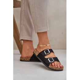 Materiałowe Klapki Na Korkowej Podeszwie Z Klamrami Czarne Atera