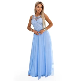 Modré dlouhé maxi šaty s vyšívanou krajkou a tylem - Numoco Basic