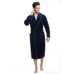 Klasický pánsky župan z mäkkého úpletu, šálový golier s kontrastným lemovaním, ozdobná výšivka na hrudi, zaväzovanie v páse, pohodlné vrecká na bokoch.