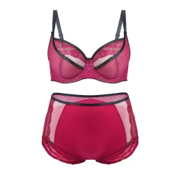 Košíčky jsou vyrobené z tylu. Vnější strana košíčků je ve spodní části pokrytá růžovou puntíkovanou síťovinou. Vrchní část košíčků pokrývá pěkná výšivka s květinovým motivem. Švy jsou zakryté páskou v grafitové barvě. Můstek je ušitý ze síťoviny zpevněné stabilním tylem. Zadní díly modelu tvoří růžové mikrovlákno. Délku ramínek je možné nastavit. Šířka ramínek je přizpůsobená velikosti košíčků a délce obvodu, a proto je podprsenka při nošení pohodlná a komfortní. Krajka a doplňky jsou vyrobené z velmi kvalitních francouzských materiálů.