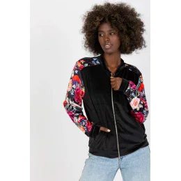 Velúrová bunda bomber na zips s vreckami na bokoch. Dlhé rukávy z farebnej kvetinovej látky.