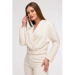 Táto dámska blúzka v zavinovacom štýle je kombináciou pohodlia a elegancie, ktorá je ideálna na každodenné nosenie aj na dovolenku. Vyrobená v Poľsku s dôrazom na detail má vpredu zapínanie v tvare písmena V, ktoré jemne zvýrazňuje výstrih a dodáva celej siluete ľahkosť. Strih je voľný v oblasti ramien a hrudníka a vďaka elastickému pásu sa blúzka harmonicky prispôsobí telu, čím zvýrazní ženské tvary. Vďaka tomuto strihu model vyzerá obzvlášť dobre na postavách v tvare hrušky, pretože vyrovnáva pomer medzi hornou a dolnou časťou. Vďaka dĺžke do pása a dlhým rukávom je funkčná a ľahko sa štylizuje v ležérnej aj spoločenskej verzii.