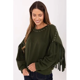 Dámska blúzka voľného strihu v jednofarebnom prevedení je štýlovým návrhom na každý deň. Je vyrobená z mäkkej zmesi viskózy a polyesteru a poskytuje pohodlie a komfort počas celého dňa. Klasický okrúhly výstrih bol ozdobený jemnými nitmi, ktoré celému kúsku dodávajú moderný charakter. Dlhé rukávy s efektnými šnúrkami a aplikáciami z nitov robia z blúzky výrazný prvok každodenných outfitov. Štandardná dĺžka a absencia zapínania z nej robia praktický a zároveň originálny kúsok šatníka.