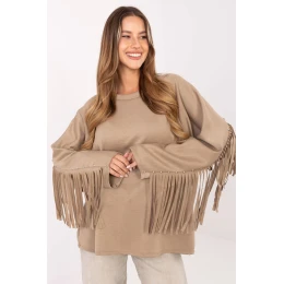 Dámska mikina s ležérnym charakterom, vytvorená s ohľadom na každodenný štýl. Mäkký materiál maslového typu, vyrobený z kombinácie viskózy a polyesteru, je jemný a neuveriteľne príjemný na dotyk. Hladká štruktúra jej dodáva všestrannosť, zatiaľ čo štandardná dĺžka a klasický okrúhly výstrih zaručujú, že sa dokonale prispôsobí postave. Dlhé rukávy sú zdobené volánmi a nitmi, ktoré celku dodávajú osobitý charakter. Volány sa nachádzajú aj na zadnej strane, čím zdôrazňujú originálny, moderný štýl mikiny. Je ideálnou voľbou pre ženy, ktoré ocenia pohodlie spojené s módnym detailom.
