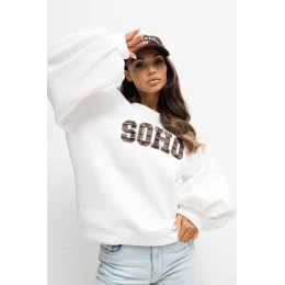 Elegantná dámska mikina s ležérnym charakterom, ideálna na každodenné pohodlné nosenie. Je vyrobená z mäkkej zmesi bavlny a elastanu, poskytuje pohodlie pri nosení a dobre sa prispôsobí postave. Model má štandardnú dĺžku, dlhé rukávy a klasický okrúhly výstrih. Mikina má na chrbte nápadný zvislý rozparok, ktorý jej dodáva moderný a originálny charakter. Na prednej strane je našitý nápis, ktorý slúži ako módny akcent. Priliehavé rukávy dodávajú celému kúsku ľahkosť a ženský štýl a vďaka ľahkému zatepleniu je skvelým kúskom aj na chladnejšie dni. Model bez zapínania, pohodlný a ideálny na každodenné nosenie.