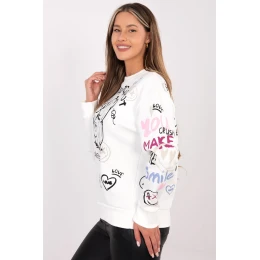 Tato dámská volnější blůza je ideální volbou na každodenní příležitosti, kombinuje pohodlí s moderním vzhledem. Model vyniká dominantním vzorem ve formě potisku a nápisů rozmístěných po celé ploše blůzy, díky čemuž získává stylizace výrazný, moderní charakter. Blůza je vyrobena z bavlny s přídavkem polyesteru, co zajišťuje pohodlí nošení, měkkost a trvanlivost materiálu. Standardní délka, dlouhý rukáv a kulatý výstřih zajišťují skvělé přizpůsobení různým postavám a tvoří univerzální kousek šatníku. Model nemá zapínání, obléká se přes hlavu, což zdůrazňuje její pohodlný, sportovní charakter. Další výhodou je zateplení, díky čemuž se blůza hodí i na chladnější dny. Stylová, praktická a příjemná na nošení, ideální na každý den!