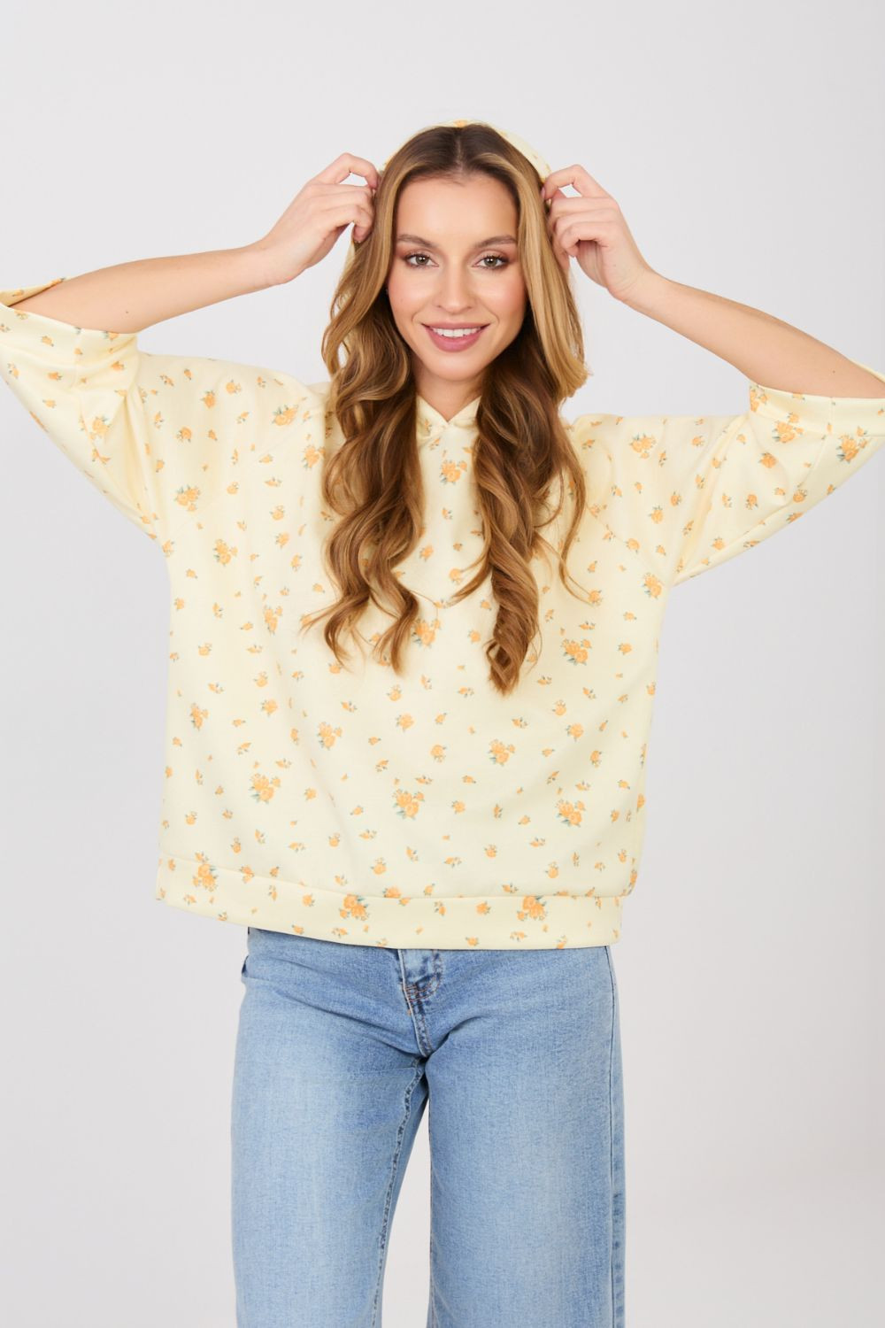 Táto ležérna dámska mikina štandardnej dĺžky je ideálnou voľbou na každý deň. Má ženskú kvetinovú potlač, ktorá dodáva štýlu sviežosť a ľahkosť. Model s 3/4 rukávmi je skvelý na prechodné ročné obdobia, pretože poskytuje pohodlie a voľnosť pohybu. Mikina nemá kapucňu ani zips, vďaka čomu má jednoduchý a univerzálny strih, ktorý sa ľahko kombinuje s mnohými štýlmi, s džínsami aj sukňami. Je vyrobená z kombinácie polyesteru, viskózy a elastanu, takže kombinuje odolnosť s jemnosťou a pružnosťou materiálu, čo zaručuje pohodlné nosenie počas celého dňa.