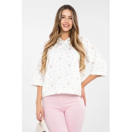 Táto ležérna dámska mikina štandardnej dĺžky je ideálnou voľbou na každý deň. Má ženskú kvetinovú potlač, ktorá dodáva oblečeniu svieži a ľahký pocit. Model s 3/4 rukávmi je skvelý na prechodné ročné obdobia, pretože poskytuje pohodlie a voľnosť pohybu. Mikina nemá kapucňu ani zapínanie, vďaka čomu má jednoduchý, univerzálny strih, ktorý sa ľahko kombinuje s mnohými štýlmi oblečenia, džínsami aj sukňami. Je vyrobená z kombinácie polyesteru, viskózy a elastanu, takže kombinuje odolnosť s jemnosťou a pružnosťou materiálu, čo zaručuje pohodlné nosenie počas celého dňa.