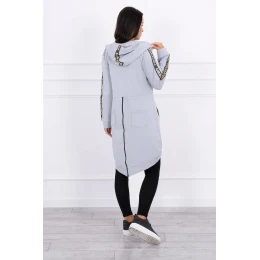 Predstavujeme vám pohodlnú dlhú mikinu s kapucňou. Mikina má zapínanie na zips a ďalší zips na chrbte. Vrecká na bokoch a dve ozdoby na zadnej strane. Mikina má našité stuhy s nápisom fashion. Mikina je vyrobená z vysoko kvalitného materiálu. Veľkosť je univerzálna a vyhovuje dámam, ktoré nosia veľkosť S, M alebo L.