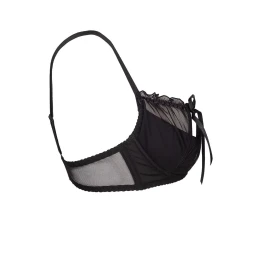 Smyslná černá polopodprsenka Charbon se svůdným vykrojením košíčků.Podprsenka je vyrobená z jemné tylové síťovinky, díky které ještě více vynikne vaše ženskost!Hravé mašličky a vlnovky dodávají na kráse celému modelu, který je doplněný o svislé kostice. Ramínka jsou nastavitelná a nelze je odepnout. Zapínání podprsenky je na dva háčky s možností třístupňového nastavení obvodu.Komplet vytvoříte s podvazkovým pásem a kalhotkami typu string Charbon.