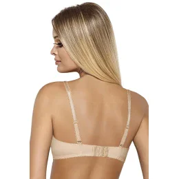 Biustonosz marki PariPari. Model Vesta. Posiada druty, które podpierają piersi odpowiednio je kształtując. Fiszbiny pionowe osadzone na bokach. Produkt posiada regulowane ramiączka z możliwością ich odpięcia. Haczyki do ramiączek metalowe. Biustonosz zapinany na haftki. Miejsce zapięcia: tył. Produkt został wykonany z 78% poliamid, 17% elastan, 5% bawełna. Produkt posiada kieszonki na wkładki. Produkt damski.parametre