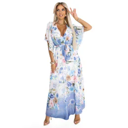 Vzdušné maxi šaty s květinovým vzorem v odstínech modré a růžové barvy s hlubokým obálkovým výstřihem, jemnými rukávy a zavazováním v pase, které krásně zvýrazňuje siluetu. Ideální na léto a výjimečné příležitosti. značka Numoco Basic - evropská výroba.