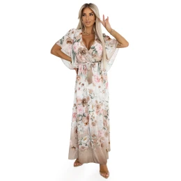 Romantické květinové maxi šaty v odstínech béžové a pudrově růžové. Lehký šifon, ženský obálkový výstřih a volné rukávy vytvářejí styling ideální pro léto, svatby nebo zahradní party. Značka Numoco Basic, evropská výroba.