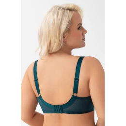 Biustonosz marki Gorsenia. Model K950 Glen. Posiada druty, które podpierają piersi odpowiednio je kształtując. Fiszbiny pionowe osadzone na bokach. Produkt posiada regulowane ramiączka bez możliwości ich odpięcia. Haczyki do ramiączek metalowe. Biustonosz zapinany na haftki. Miejsce zapięcia: tył. Produkt został wykonany z 90% poliamid, 7% elastan, 3% poliester. Produkt damski.