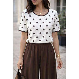 Tento módní dámský svetr klasického střihu je dokonalou kombinací pohodlí a nadčasového stylu. Model s krátkými rukávy a kulatým výstřihem je ideální pro každodenní stylizaci a zajišťuje pohodlí a volnost při nošení. Půvabný hráškový vzor mu dodává lehký a ženský charakter, zatímco jemné zakončení ve výstřihu a na rukávech podtrhuje decentní eleganci. Svetr se dobře hodí ke kalhotám i sukni a vytváří univerzální základ pro mnoho outfitů. Je vyroben z vysoce kvalitní směsi bavlny (50 %) a akrylu (50 %), je měkký, příjemný na dotek a dobře se přizpůsobí postavě. Materiál je odolný, snadno se udržuje a je vhodný pro nošení po celý rok.