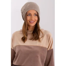 Teplá dámska zimná čiapka z hladkého úpletu s ozdobnou aplikáciou na boku.