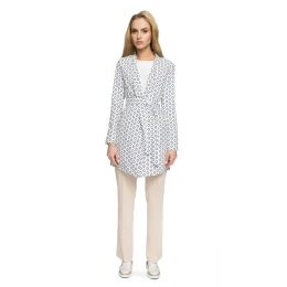 Tento štýlový a veľmi žensky pôsobiaci kabát z potlačenej látky vás ochráni pred chladom počas chladnejších dní a bude elegantným doplnkom k šatám alebo iným outfitom so sukňami či nohavicami. Je plne podšitý, prepásaný opaskom, k dispozícii v štyroch farebných variantoch.