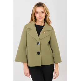 Tento elegantný dámsky prechodný kabát vyrobený z moderného penového materiálu je štýlovou ponukou na jeseň, zimu a jar. Je vyrobený z vysokokvalitnej kombinácie polyesteru a elastanu, vďaka čomu poskytuje pohodlie pri nosení, ľahkosť a estetické prispôsobenie sa postave. Model s krátkou dĺžkou a hladkým vzorom je ideálny na každodenný styling aj do práce. 3/4 rukávy dodávajú kabátu jemnú eleganciu a ľahkosť. Jednoradové zapínanie na gombíky zdôrazňuje klasický charakter strihu. Kabát nemá podšívku ani výplň, takže je ideálny ako prechodný kúsok. Praktické vrecká dodávajú funkčnosť a ozdobná brošňa dodáva eleganciu a dotvára celkový vzhľad.