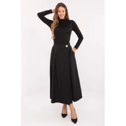 Táto elegantná midi sukňa je dokonalou kombináciou klasiky a pohodlia, ktorá sa skvele hodí na bežné nosenie, do práce alebo na formálne udalosti. Sukňa je vyrobená z vysokokvalitnej zmesi polyesteru a elastanu, čo zaručuje pohodlie pri nosení, odolnosť a krásny padavý materiál. Model s hladkou textúrou má vpredu plisovanú časť, ktorá dodáva ľahkosť a ženský charakter. V zadnej časti je vložená guma, vďaka ktorej sa sukňa dokonale prispôsobí postave a poskytuje pohodlie počas celého dňa. Ďalšou výhodou sú bočné vrecká a ozdobné gombíky, ktoré jemne podčiarkujú elegantný štýl modelu. Sukňa je bez zapínania mimoriadne praktická a ľahko sa oblieka. Je to univerzálny kúsok šatníka, ktorý sa skvele hodí na kancelársky styling aj formálne stretnutia.