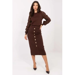Elegantná pletená sukňa s hladkým vzorom, ktorá sa skvele hodí na každý deň, do práce aj na slávnostnejšie udalosti. Je vyrobená z vysokokvalitnej zmesi viskózy a polyesteru, čo zaručuje pohodlie pri nosení, mäkkosť a ľahkú pružnosť, ideálne sa prispôsobí postave. Model v midi dĺžke predstavuje nadčasový, klasický štýl. V páse je vsadená gumová vložka, vďaka ktorej sukňa dokonale sedí a poskytuje pohodlie počas celého dňa. Nemá zapínanie, čo je mimoriadne praktické a ľahko sa oblieka. Vpredu sú umiestnené ozdobné gombíky, ktoré celku dodávajú eleganciu a jemne zvýrazňujú minimalistický strih. Je ideálnou voľbou pre ženy, ktoré ocenia kombináciu elegancie, pohodlia a univerzálneho štýlu.