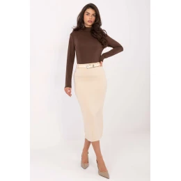 Elegantní úpletová sukně vyrobena z pruhované látky, která se krásně přizpůsobuje postavě a zdůrazňuje ženské tvary. Díky vysoce kvalitní směsi viskózy a polyesteru je model měkký, elastický a velmi pohodlný na nošení. Sukně má midi délku, což jí dodává elegantní charakter a skvěle se hodí jak na společenské události, do práce, tak i na každý den. V pasu je vsazena gumová pásek, která zajistí ideální přizpůsobení a pohodlí po celý den. Navíc je model vybaven zapínacím páskem, který zdůrazňuje pas a dodává stylizaci eleganci. V zadní části dole je jemné rozštěp, které zvyšuje volnost pohybu a dodává sukně lehkosti. Díky absenci tradičního zapínání je mimořádně pohodlná a snadno se obléká. Jedná se o univerzální nabídku pro ženy, které oceňují eleganci, pohodlí a nadčasový styl.