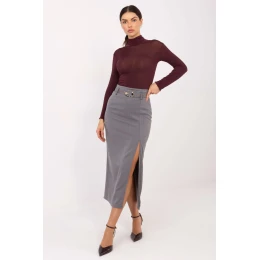 Elegantná, štýlová sukňa v midi dĺžke, ktorá je ideálna na formálne udalosti, večerné akcie a večierky. Materiál je vyrobený z kombinácie polyesteru, elastanu a viskózy, je mäkký na dotyk, mierne elastický a krásne sa prispôsobí postave. Hladký vzor zdôrazňuje klasický, nadčasový charakter modelu. Sukňa má vpredu rozparek, ktorý jej dodáva moderný, ženský nádych a zároveň zabezpečuje pohodlie pri pohybe. Pás je zazipsovaný, čo umožňuje ideálne prispôsobenie a zvýrazňuje ženskú siluetu. Celkový vzhľad je elegantný a minimalistický s krytým zipsom.