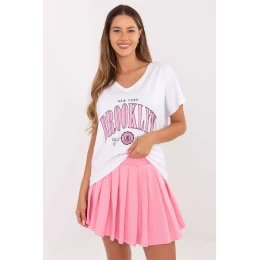 Ležérna dámska súprava pozostávajúca z trička a plisovanej sukne, ktorá je ideálna na každodenné nosenie. Tričko vyrobené z mäkkej bavlny s prídavkom elastanu má krátke rukávy, srdiečkový výstrih a módnu potlač na prednej strane, ktorá dodáva oblečeniu charakter. Mini sukňa s vysokým pásom je vyrobená z rovnakého príjemného materiálu a má vložené šortky, ktoré zabezpečujú voľnosť pohybu. Plisovaná konštrukcia dodáva súprave ľahkosť a ženskú eleganciu a vytvára súpravu, ktorá spája pohodlie s módnym ležérnym štýlom.
