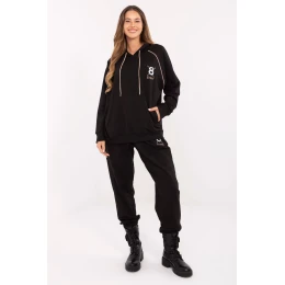 Dámska súprava na hranie v ležérnom štýle, vytvorená s ohľadom na každodenný štýl. Je vyrobená z bavlny s prídavkom elastanu, čo zaručuje mäkkosť, pohodlie a voľnosť pohybu. Mikina s kapucňou s nastaviteľnými šnúrkami a dlhými rukávmi má na prednej strane výšivku zdobenú jemnými zirkónmi, ktoré súprave dodávajú elegantný akcent. Nohavice s vysokým pásom a dlhými nohavicami zakončené manžetami majú praktické bočné vrecká, vďaka ktorým sú pohodlné a funkčné zároveň. Ide o súpravu na hranie, ktorá spája športové pohodlie s nádychom ženského pôvabu.