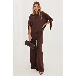 Dámský komplet skládající se z blůzy a kalhot je pohodlný a stylový návrh na každý den i do práce. Vyrobený z měkké a příjemné látky s přídavkem viskózy a elastanu zajistí pohodlí nošení, volnost pohybů a dobré přizpůsobení se postavě. Blůza má klasický, kulatý výstřih a rukávy délky 3/4 zakončené vázáním, co dodává celku jemně ženský charakter. Hladký materiál dělá, že komplet vypadá minimalisticky a elegantně, díky čemuž je snadné ho sladit s různými stylizacemi. Kalhoty mají dlouhé, široké nohavice a praktické kapsy po stranách, které zvyšují funkčnost modelu. V pasu je vsazena elastická guma, co zaručuje pohodlné přizpůsobení bez stlačování. Jedná se o univerzální set ideální jak pro každodenní stylizace, tak i do práce, spojující pohodlí s moderním, uklizeným vzhledem.