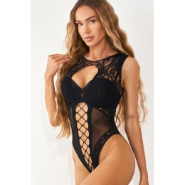 Černé dámské bodystocking BUTIQUE NIGHT spojuje luxusní krajku a odvážnou smyslnost. Model BUTIQUE NIGHT je nabídkou pro ženy, které chtějí vyniknout prádlem plným charakteru. Vyrobeno z černé krajky s síťovými vložkami jemně zdůrazňuje siluetu, spojuje eleganci s dravým ženským kouzlem. Výstřih na dekoltu a široká ramínka zdůrazňující linii ramen a prsou vytvářejí efektní a tajemný výstřih. Elastické síťové vložky vpředu a po stranách opticky zúžují pas a dodávají lehkost. Zadní část ve stylu high-leg s ažurovým motivem exponuje hýždě a dodává smyslný charakter. BUTIQUE NIGHT je body vytvořené pro výjimečné smyslné, odvážné a luxusní okamžiky. Skvěle poslouží jak jako svádějící prádlo, tak jako prvek budoárového stylu. elastan 5%
