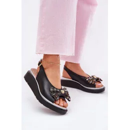 Tieto dámske sandále z prírodnej kože s klinovou podrážkou sú elegantnou a pohodlnou voľbou na letné dni. Zapínajú sa na pracku s nastaviteľným remienkom, čo zaručuje skvelé prispôsobenie sa nohe. Na prednej strane majú roztomilú mašľu so zlatým detailom, ktorá im dodáva jemný šarm. Skvele sa hodia k šatám, sukniam alebo nohaviciam a spájajú pohodlie s módnym vzhľadom. Ideálne na každodenné vychádzky aj výnimočné príležitosti.