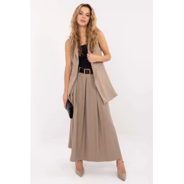 Elegantná dlhá dámska vesta bez zapínania je štýlovým základom mnohých outfitov. Je vyrobená z kvalitného materiálu z kombinácie polyesteru a elastanu, ktorý poskytuje pohodlie a elegantný vzhľad. Model má goliere a rozparky na bokoch, ktoré dodávajú postave ľahkosť a voľnosť pohybu. Hladká tkanina zdôrazňuje univerzálny charakter vesty a podšívka zabezpečuje estetický dizajn. Strih bez rukávov sa dobre kombinuje s košeľou, blúzkou alebo tenkým rolákom. Je ideálna na mnohé príležitosti, hodí sa k elegantným outfitom na návštevu, do práce a k elegantnému každodennému štýlu.