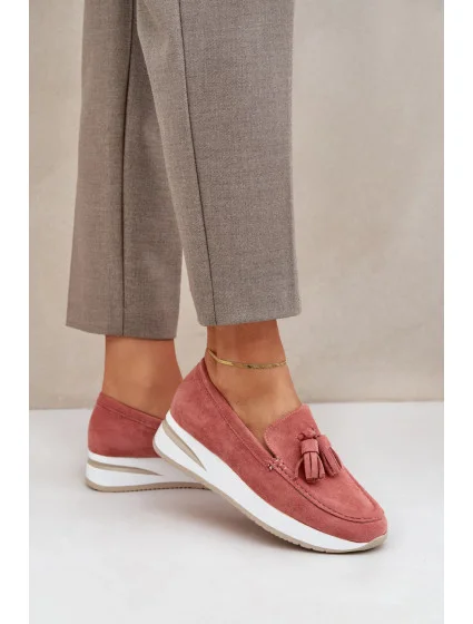 Mokasíny vyrobené z organického semišu. Umiestnené na platforme a jemnom podpätku poskytujú pohodlie a ľahkosť siluety. Vďaka okrúhlej špičke sú topánky veľmi pohodlné a mäkká stielka sa postará o pohodlie počas celého dňa. Celkový vzhľad dotvárajú ozdobné riasy, ktoré dodávajú originálny charakter a štýl. Perfektné na každodenné outfity!