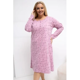 Pohodlná a štýlová nočná košeľa plus size, ktorej dominujú roztomilé bodky, ktoré dodávajú ľahkosť a ženský charakter. Model je vyrobený prevažne z mäkkej, príjemnej bavlny, ktorá zaručuje pohodlie počas spánku a jednoduché nosenie. Košeľa má klasický okrúhly výstrih a dlhé rukávy, ktoré chránia pred chladom. Vpredu sú štyri decentné gombíky, ktoré dodávajú jemný detail a uľahčujú obliekanie. Vďaka dĺžke po kolená je košeľa elegantná a zároveň voľná. Absencia zapínania dodáva modelu ľahkosť a jednoduchosť, čo je ideálne na domáce relaxovanie.