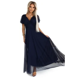 Tmavě modré dlouhé dámské šaty s výstřihem a krátkými rukávy model 20625780 - numoco basic