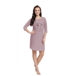 Dámska nočná košeľa 71 Luna - vyrobené z kvalitnej bavlny príjemné na dotyk - kávová farba - s potlačou na prednej strane - trojštvrťové rukáv - dĺžka nad kolená