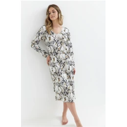 Táto dámska nočná košeľa je elegantnou ponukou na pokojný spánok. Je vyrobená z mäkkej tkaniny s potlačou a poskytuje pohodlie a potešenie pri celonočnom nosení. Bodkovaný výstrih zdobený jemnou čipkou jej dodáva jemný pôvab. Dĺžka po kolená a voľný, pohodlný strih zaručujú voľnosť pohybu, zatiaľ čo dlhé rukávy, tiež zdobené čipkou, podčiarkujú jej elegantný charakter. Celý kúsok je zabalený v praktickom fóliovom vrecúšku, takže je skvelým darčekom.