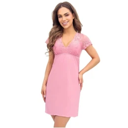 Elegantná nočná košieľka s výstrihom do V zakončeným jemným čipkovým lemom. Vrchná časť je zdobená čipkou a pod prsiami má gumu na jemné zvýraznenie postavy. Košieľka je vyrobená z hladkej, mäkkej viskózy, má čipkované rukávy a voľný, pohodlný strih, ktorý zaručuje pohodlie počas spánku. Balená v elegantnej škatuľke, ideálna ako darček.